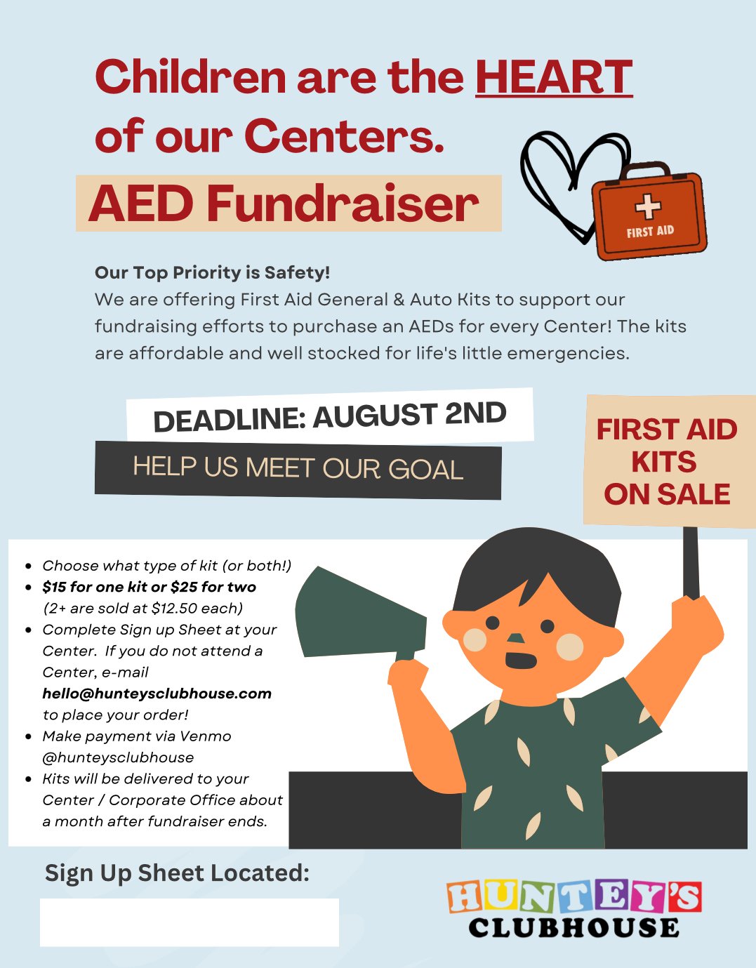 Hello everyone! We are fundraising for AED machines at each center. According to the American Heart Association, an AED machine stands for an Automated External Defibrillator. This machine is a lightweight, portable device that sends electric shocks through the chest to bring the heart rhythm back to normal. Immediate CPR and the use of an AED machine can double to triple the chances of a person’s survival in an emergency (American Heart Association, 2023). Please consider purchasing a first aid kit (or 2!) and supporting our endeavors! We are offering First Aid General & Auto Kits for sale to fundraise for the AEDs. We want to provide the safest environment for our families that we possibly can. See the attached flyer for pricing & more details. You can sign up at your center, reach out to hello@hunteysclubhouse.com, or call (616)-557-6887 to place an order! The fundraiser deadline is August 2nd. Help us meet our goal! Thank you!
